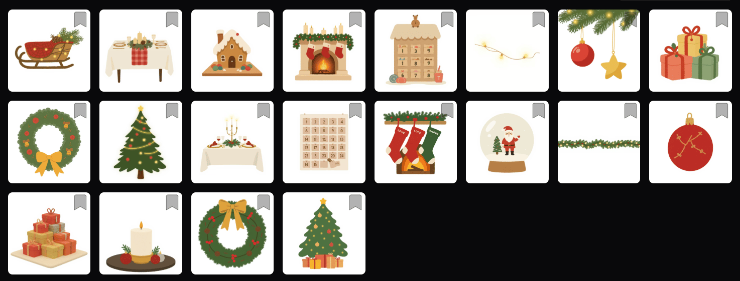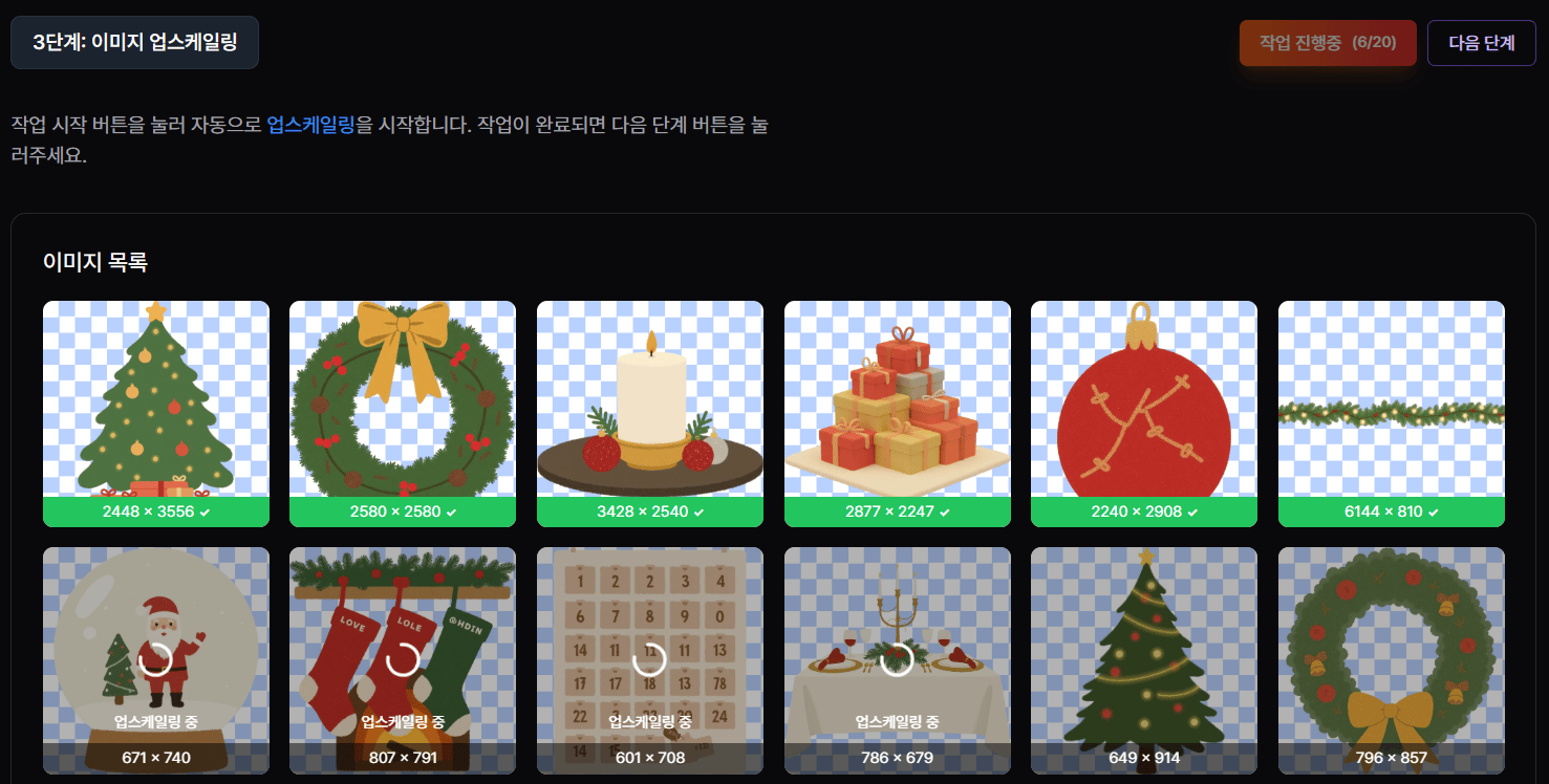 "크리스마스 장식 요소들" → 20장 이상의 다양한 스타일 자동 생성