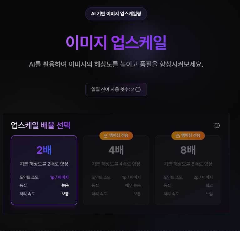비용 | 각 사이트별 결제 | 가입 시 무료 체험 업스케일링 / 키워드 추출 매일 무료 포인트 제공 시간 / 비용 10배 이상 절약 |